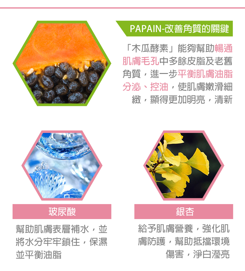 主要功效:減少油脂分泌,緊緻毛孔,幫助油水平衡、肌膚明亮細緻