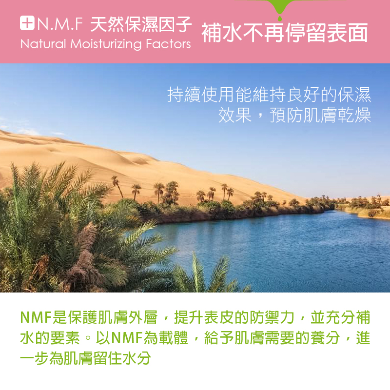 Tips: N.M.F Natural Moisturizing Factors 是保護肌膚外層,提升表皮防御力,並充分補水的要素。 改善脆弱泛紅、鬆弛下垂、缺水無彈性、細紋皺紋等問題 好用實測