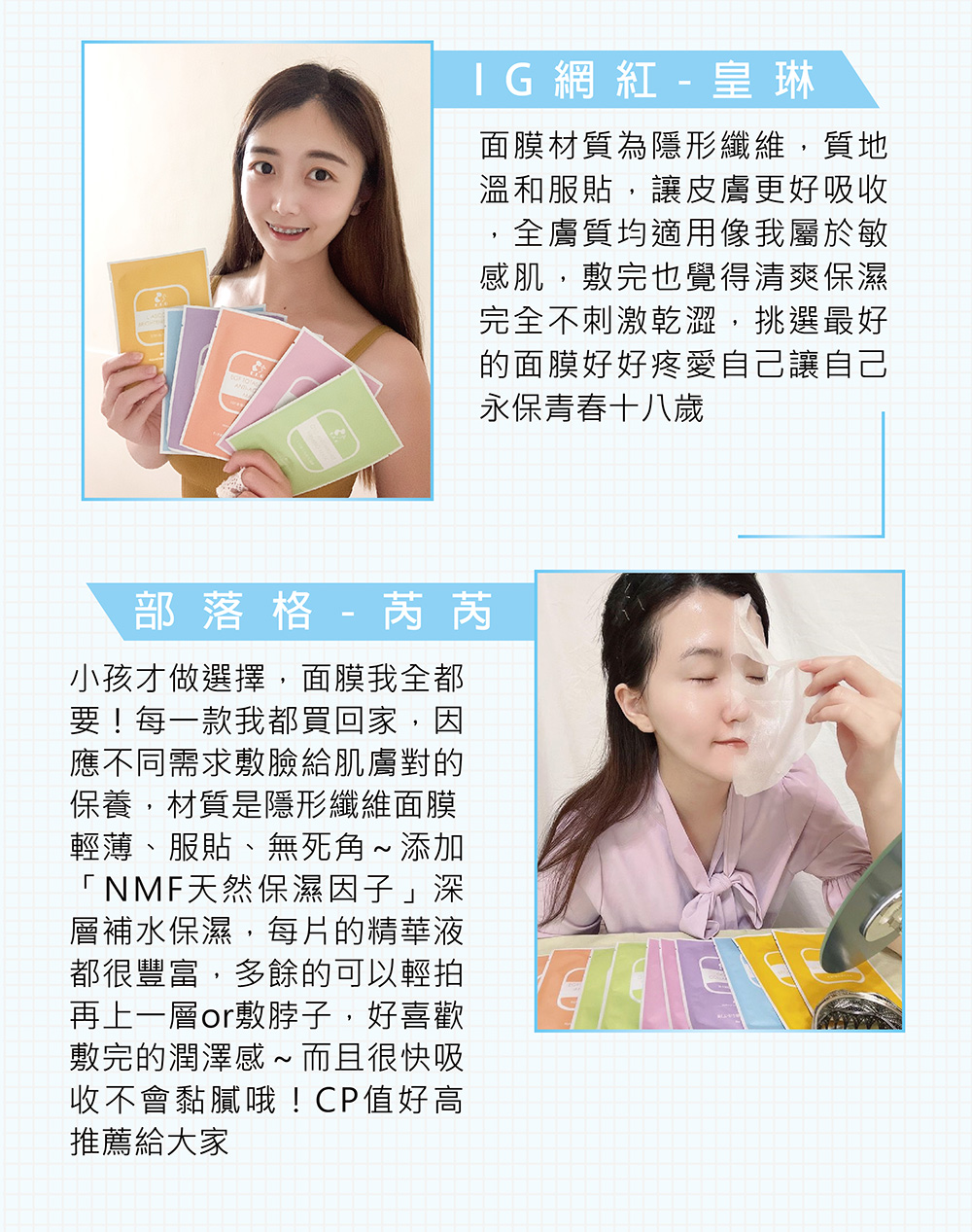 使用植物纖維製成的面膜,極致薄透的隱形布 輕薄服貼,完美貼合臉部無死角 柔軟舒適,締造如SPA享受 鎖住精華,一滴不流失 添加N.M.F天然保濕因子 補水不停留表面