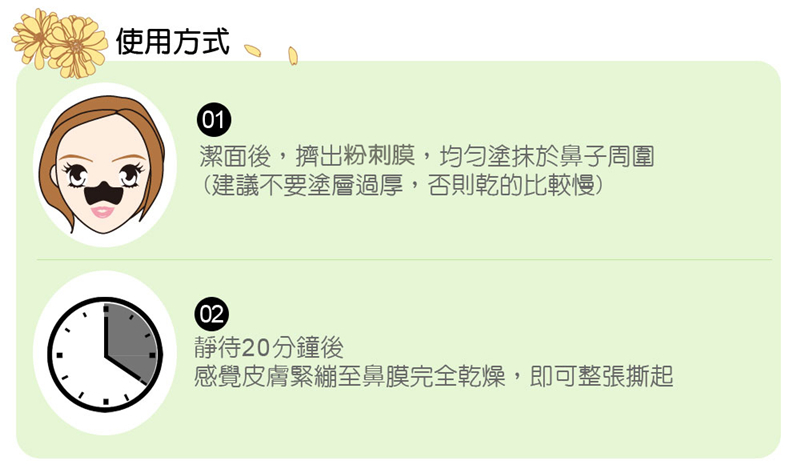 使用方式:潔面後,擠出粉刺膜,均勻塗抹鼻子周圍(建議不要塗層過後,否則乾得比較慢) 靜待20分鐘後,感覺皮膚緊繃至鼻膜完全乾燥,即可整張撕開
