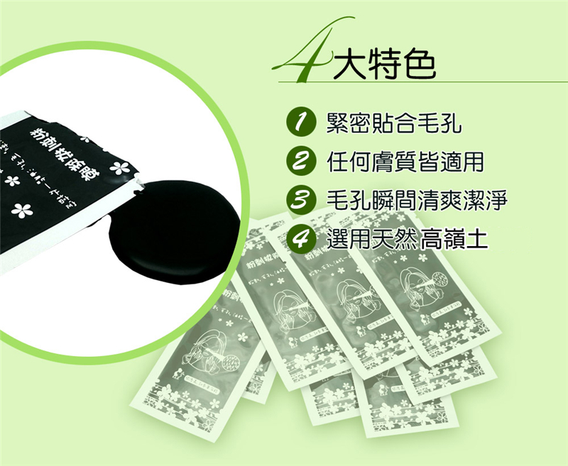 竹炭粉刺撕除膜的四大特色:1.緊密貼合毛孔 2.任何膚質皆適用 3.毛孔瞬間清爽潔淨 4.選用天然高嶺土