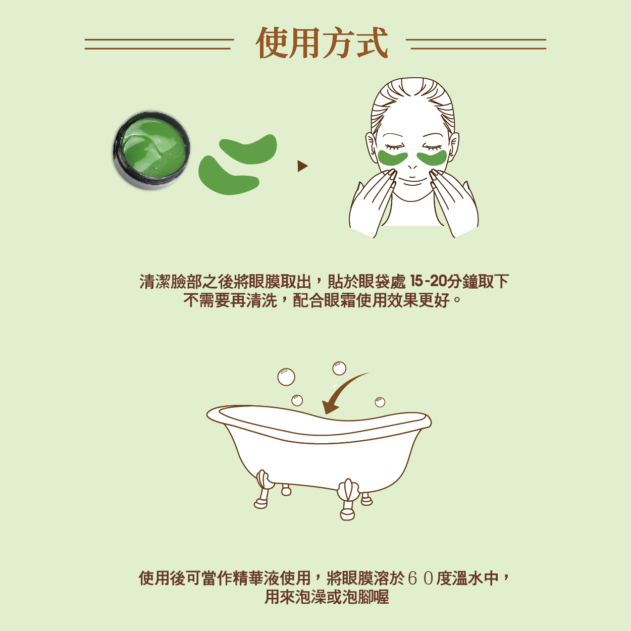 使用方法:潔面後將眼膜取出,貼於眼袋處15~20分鐘後取下,不需在清洗,配合眼霜使用效果更佳