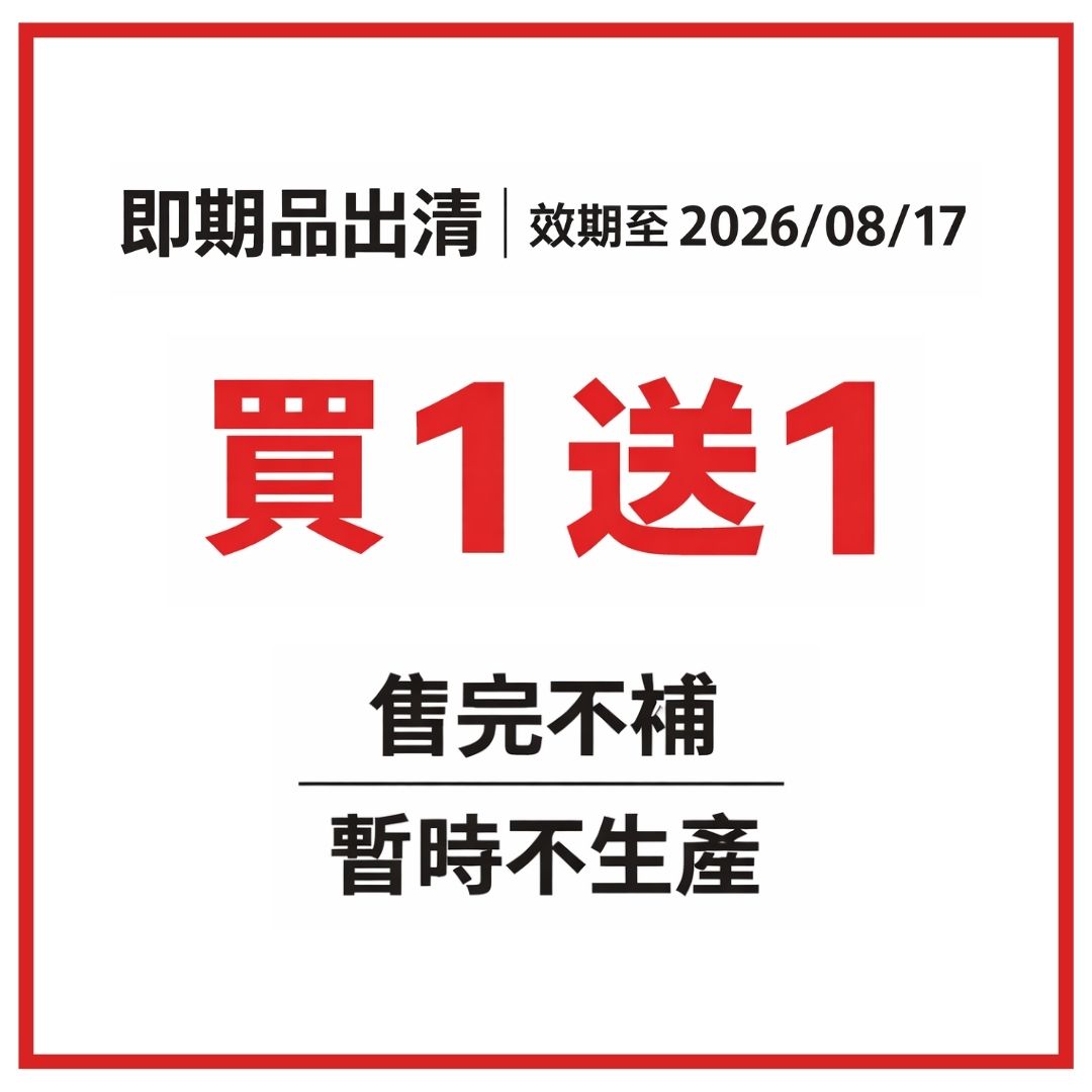 本商品為即期出清品,效期至 2026 年 8 月17 日。因產品暫時停產,故提供 “買 1 送 1” 優惠。