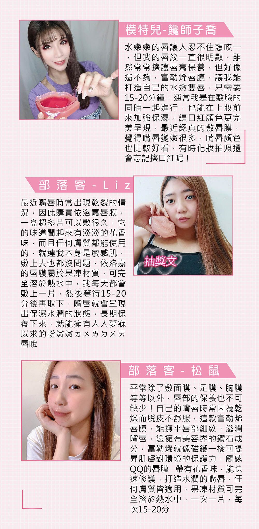 使用方法:潔面後,將唇膜取出貼於嘴唇處,待15-20分鐘後取下即可,不需要再清洗