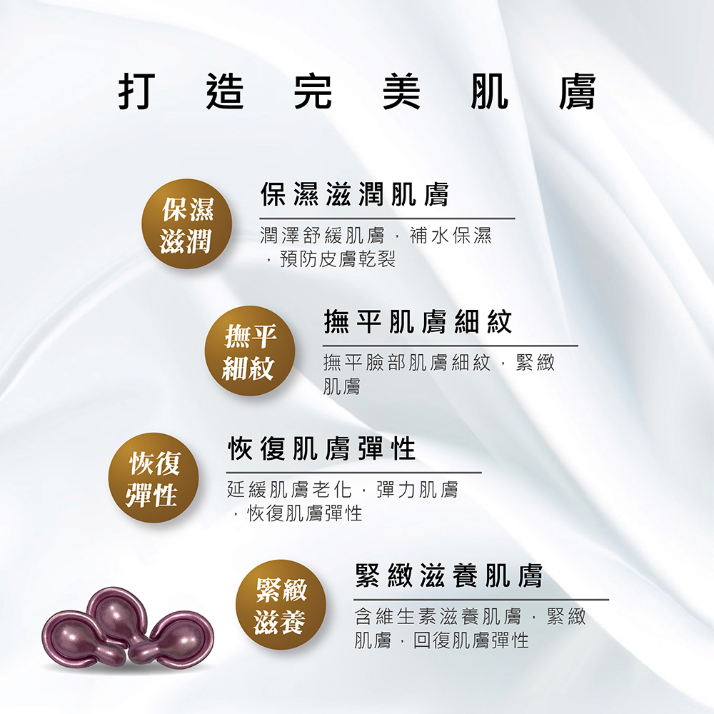 功效:恢復肌膚彈性、撫平肌膚細紋並滋潤保濕肌膚