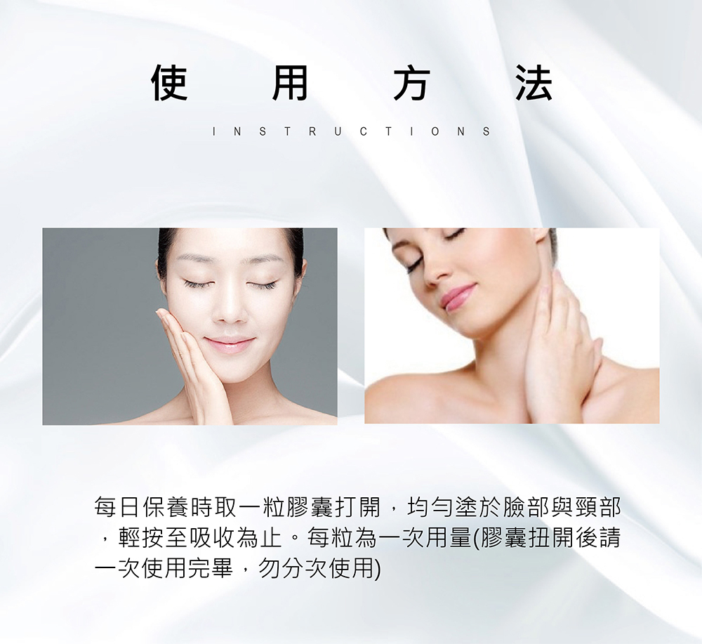 使用方法:每日保養時取一粒膠囊打開,均勻塗於臉部與頸部,輕按至吸收為止,每粒為一次用量(膠囊扭開後請一次使用完畢,勿分次使用)