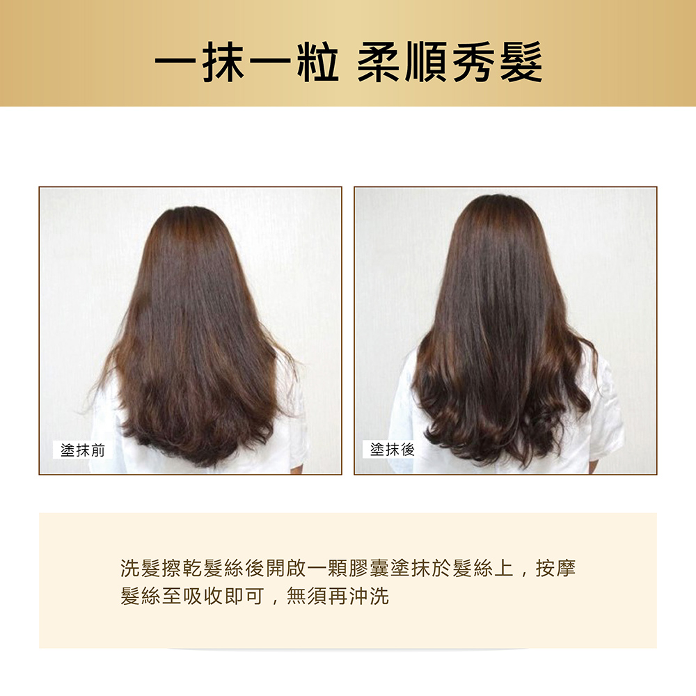 使用方法:洗髮擦乾髮絲後開啟一顆膠囊塗抹於髮絲上,按摩髮絲至吸收即可,無需再沖洗